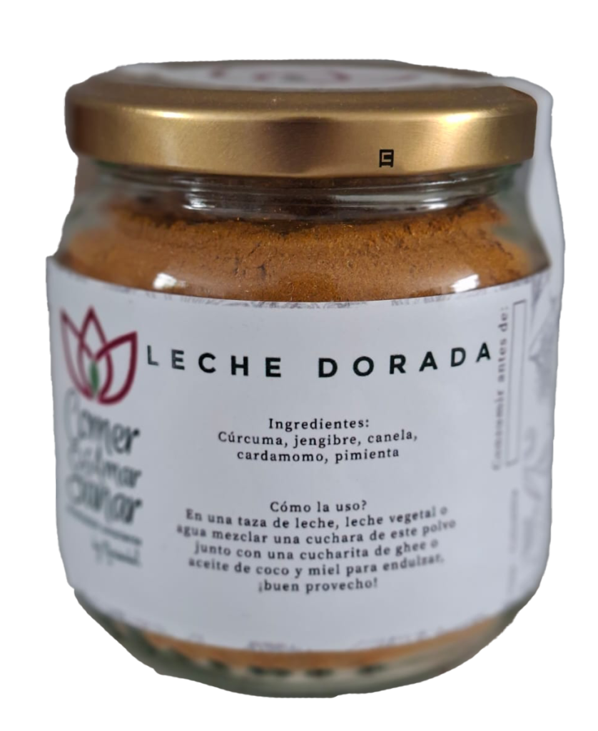 La leche dorada, es una combinacion de especias a base de cúrcuma, pimienta negra, cardamomo, jengibre y canela, es antiinflamatoria y antioxidante potente que puede llegar a reforzar el sistema inmunológico, mejorar la digestión y reducir el dolor articular. Ayuda a conciliar el sueño, depurar el hígado y mejora la salud cardiovascular, ideal para tomar como té en agua caliente o leche vegetal antes de dormir o en el desayuno.